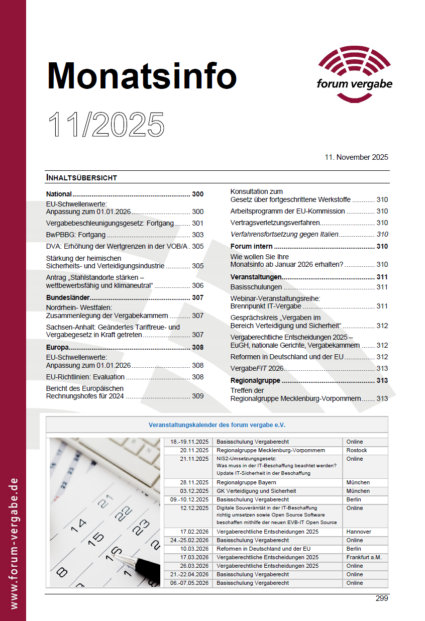 In der Schriftenreihe des forum vergabe ist Ende März das Heft 16 „Vergabefremde Regelungen und Beihilferecht“ erschienen. In diesem Buch befassen sich die Autoren Prof. Dr. Meinrad Dreher, Rechtsanwältin Gabriele… Heft 16 bei der Schriftenreihe des forum erschienen weiterlesen